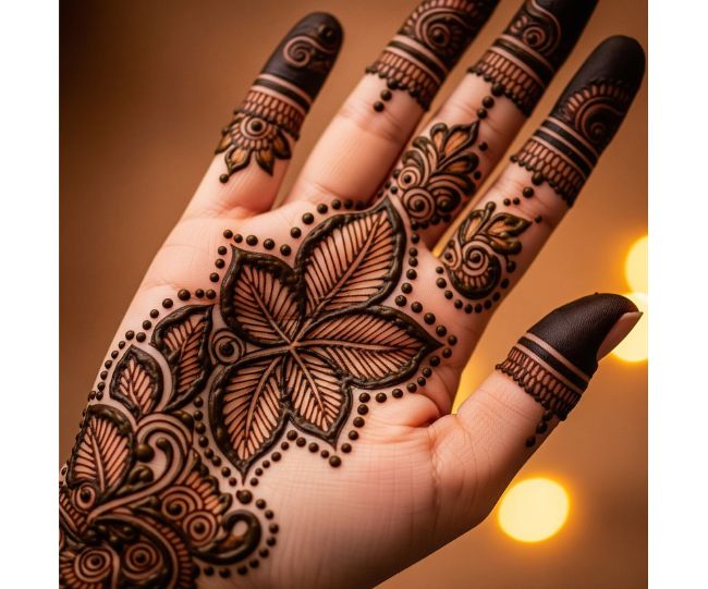 यह एक क्लासिक डिजाइन है जिसे कोई भी आसानी से बना सकता है। इसमें आप हाथ के बीच में कुछ बड़ी पत्तियां बना सकती हैं और उन्हें छोटे-छोटे डॉट्स से सजा सकती हैं। उंगलियों पर भी आप पत्तियों और डॉट्स का कॉम्बिनेशन बना सकती हैं। सबसे अच्छी बात है कि यह डिजाइन ट्रेडिशनल भी लगता है और बनाने में भी आसान है।