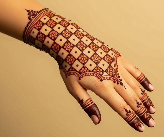 यह डिजाइन थोड़ा ट्रेंडी और मॉडर्न है। अपनी कलाई से शुरू करके एक चौड़ा चेकर्ड पैटर्न बनाएं जो हाथ के ऊपरी हिस्से तक जाए। आप हर छोटे चेक बॉक्स में एक छोटा फूल या बिंदी भी बना सकती हैं। बाकी हाथ को आप खाली छोड़ सकती हैं या सिर्फ उंगलियों पर हल्के डिजाइन बना सकती हैं। बता दें, यह पैटर्न दिखने में बहुत खूबसूरत लगता है।