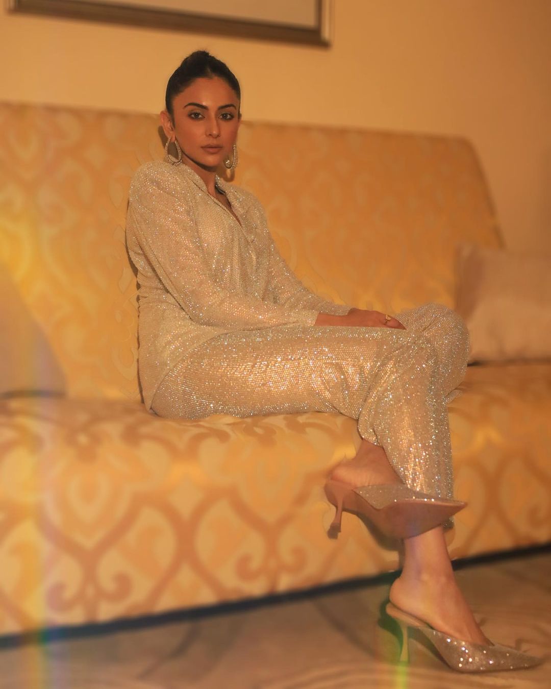 रकुलप्रीत सिंह के लेटेस्ट लुक की बात करें, तो वह ऑल शिमरी लुक में देखई जा सकती हैं। उन्होंने शिमरी पैंट सूट के साथ, शिमरी हील्स और मैचिंग शिमरी ईयरिंग्स पहन रखे हैं।