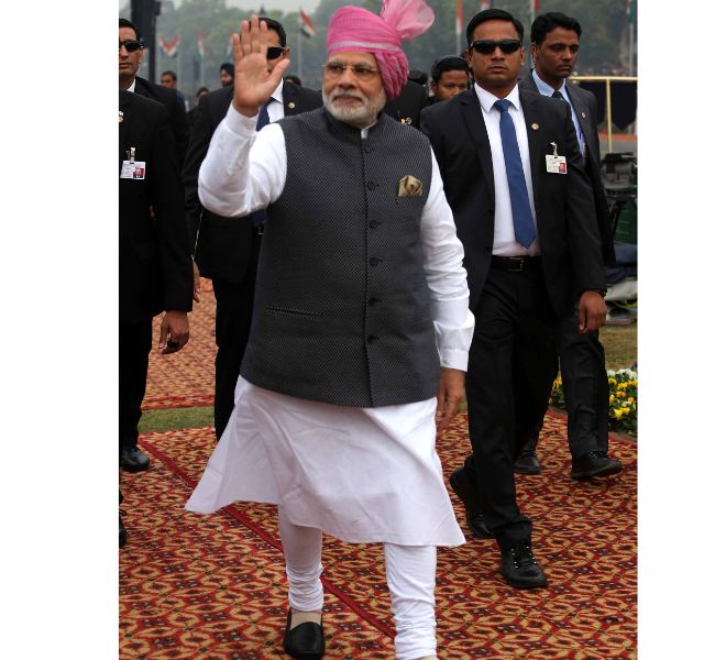 - 2017- इस साल प्रधानमंत्री मोदी ने गुलाबी रंग की पगड़ी पहनी थी, जिसपर सफेद रंग से बॉर्डर बना था। इसके साथ उन्होंने सफेद रंग का कुर्ता-पायजामा और काले रंग की जैकेट पहनी थी।