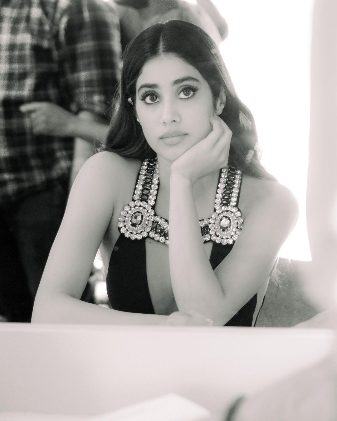 मेकअप की बात करें तो, जान्हवी ने स्मोकी आईशैडो, ब्लैक आईलाइनर, ब्लैक कोहल, मस्कारा से भरी आईलैशेज, शार्प आइब्रो के साथ न्यूड लिपस्टिक कैरी किया है।