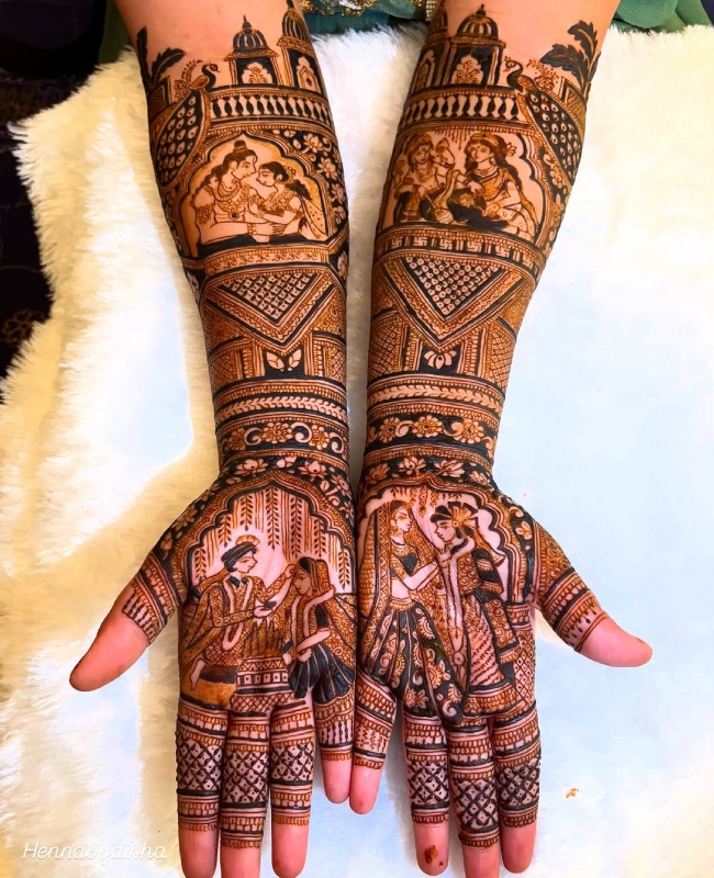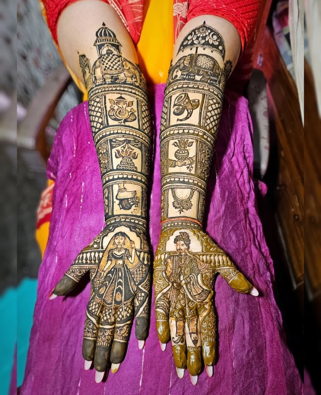 अगर आप इस वेडिंग सीजन आप भी पिया के नाम की मेहंदी रचाने वाली हैं, तो इस डिजाइन को ट्राई कर सकती हैं। ब्राइडल मेहंदी की यह डिजाइन आमतौर पर लगाई जाने वाली ब्राइडल मेहंदी से काफी अलग, लेकिन खूबसूरत होती है। इसमें हाथों में दूल्हा-दुल्हन के साथ ही शंकर-पार्वती भी बनाए जाते हैं।