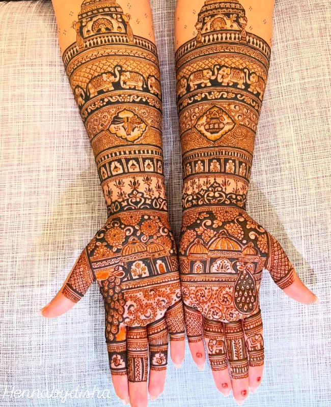 ब्राइडल मेहंदी की यह डिजाइन भी इन दिनों काफी ज्यादा ट्रेंड में है। यह पारंपरिक मेहंदी डिजाइन से बेहद अगल आपको क्लासी और डिसेंट लुक देगी। इस मेहंदी डिजाइन में मुख्य रूप से डोली, कलश, हाथी और गठबंधन बनाए जाते हैं, तो ब्राइड को एक नया लुक देगी।