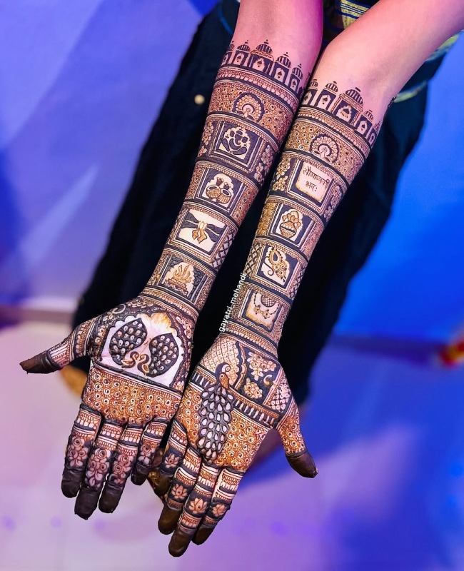आप ब्राइडल मेहंदी के लिए इस डिजाइन को भी ट्राई कर सकती हैं। यह बेहद खास डिजाइन है, जिसे बनाने के लिए शादी के अलग-अलग चिह्नों जैसे गठबंधन, विवाह की वेदी, नगाड़े-शहनाई, श्री गणेश आदि का इस्तेमाल किया गया है।