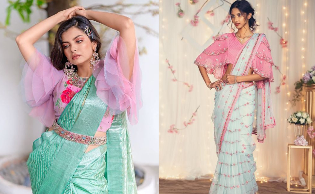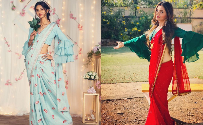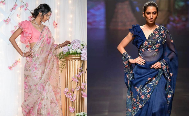 फ्रिल स्वील्स वाले ब्लाउज़ का कॉम्बिनेशन भी साड़ी के साथ बहुत ही स्टाइलिश लगता है। इनमें आप शॉर्ट लेंथ के साथ लॉन्ग स्लीव्स भी ट्राय कर सकती हैं।
