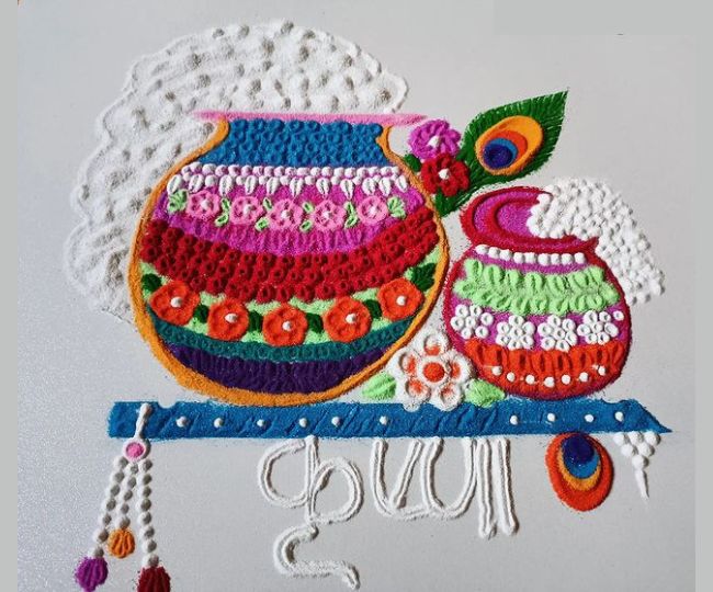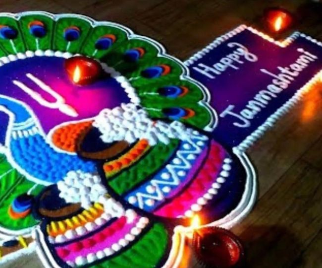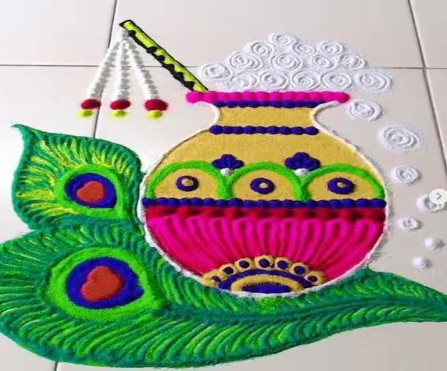 अगर आपको भी रंगोली में कोई खास डिजाइन सूझता नहीं है, तो सिंपल तरीके से मोरपंख और मटकी बनाकर हैप्पी जन्माष्टमी लिख सकते हैं। देखने में खूबसूरत लगने के साथ-साथ यह बनाने में भी बेहद आसान है।