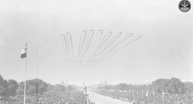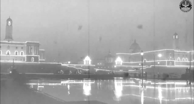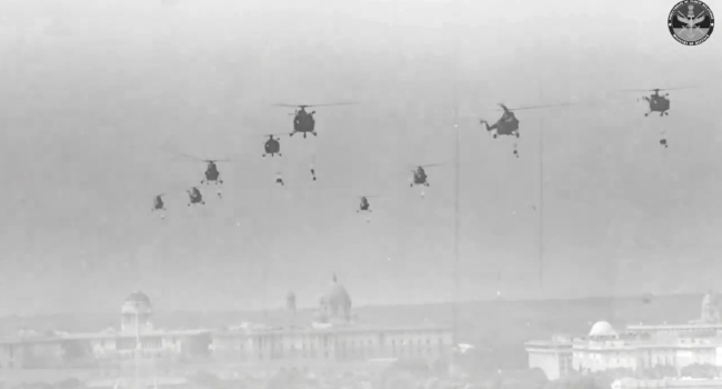 समारोह के अंत में आसमान में छाए कोहरे के बीच वायु सेना के 46 विमानों द्वारा फ्लाई-पास्ट के साथ परेड का समापन हुए। इस दौरान मिग 29, अपाचे, प्रचंड, डकोटा, राफेल जैसे विमानों द्वारा आसमान में करतब दिखाए गए।