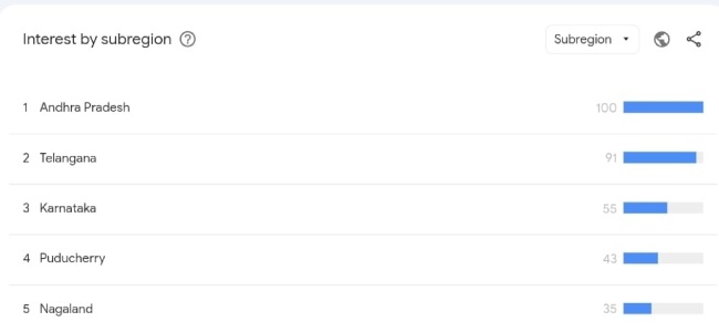 आंकड़ों के मुताबिक आंध्र प्रदेश, तेलंगाना, कर्नाटक समेत दक्षिण भारत में सबसे ज्यादा इस टर्म को सर्च किया गया है। इसके अलावा पुडुचेरी और नागालैंड में भी लोग इसे काफी सर्च कर रहे हैं।