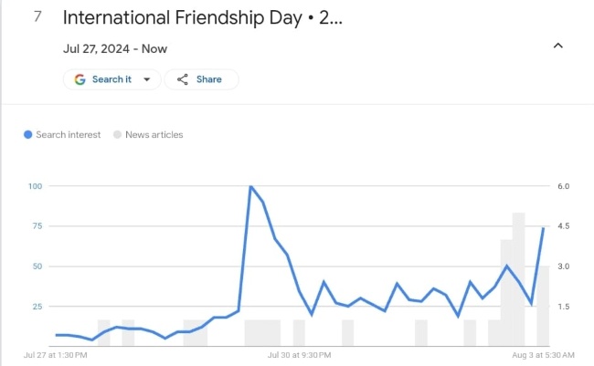 यही वजह है कि इंटरनेट पर फ्रेंडशिप डे की सर्चिंग में उछाल देखने को मिल रहा है। नीचे दिए ग्राफ से यह साफ नजर आ रहा है कि पिछले कुछ दिनों से इस टर्म की सर्चिंग में लगातार उतार-चढ़ाव रहा है।