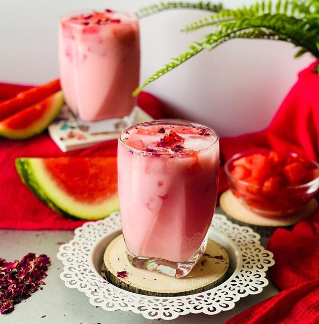 - एक जग में ठंडा दूध, पानी और तरबूज का रस डालें। अच्छी तरह से मलाएं। अब इसमें गुलाब सिरप, चीनी डालें और तब तक मिलाएं जब तक कि सब कुछ पूरी तरह से घुल न जाए और मिश्रण एक सुंदर गुलाबी रंग का न हो जाए।
