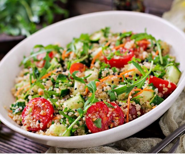 क्विनोआ को उबालकर फुला लें। फिर इसमें बारीक कटे हुए ताजे खीरा, रसदार टमाटर, प्याज, और रंगीन शिमला मिर्च मिलाएं। स्वादानुसार जैतून का तेल और ताजा नींबू का रस निचोड़ें। आखिर में, समुद्री नमक और काली मिर्च पाउडर डालकर सर्व करें।