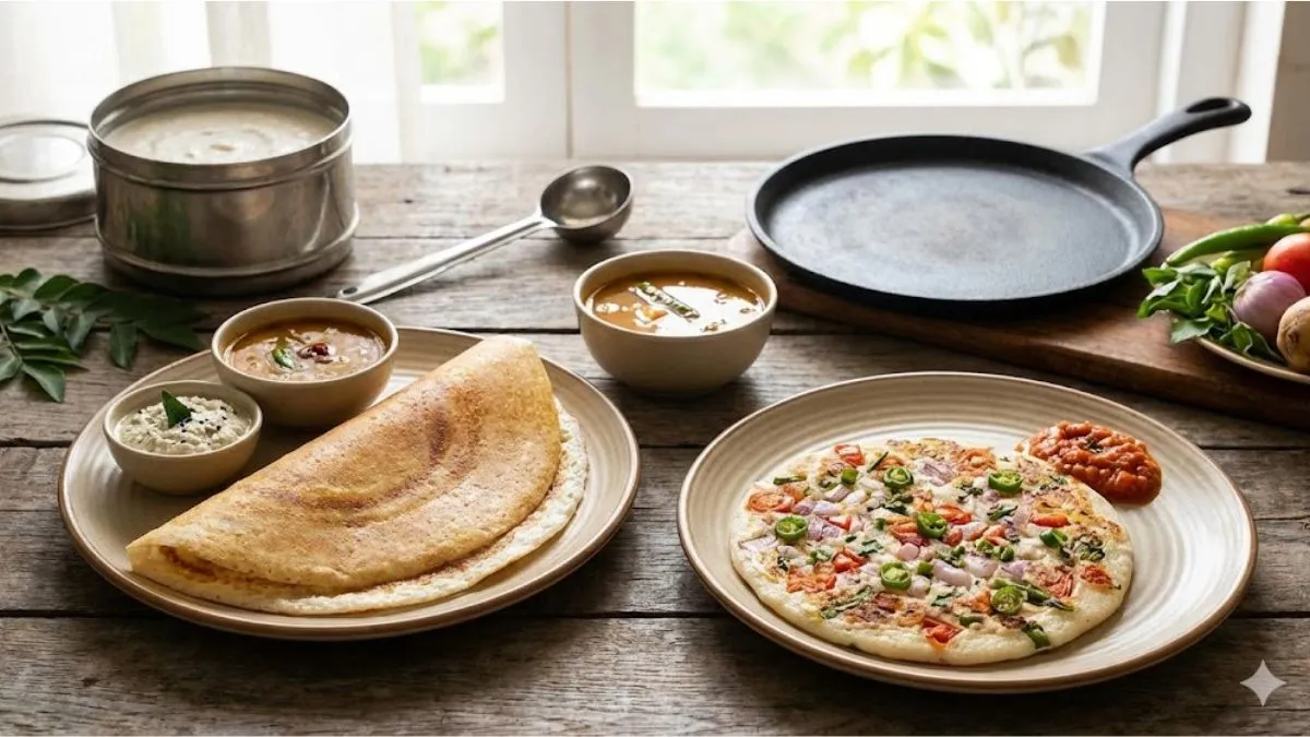 फर्मेंटेड होने के कारण ये प्रोबायोटिक्स का अच्छा सोर्स होते हैं, जिनसे गट हेल्थ स्वस्थ रहती है। इसलिए अगर आप ब्रेकफास्ट में कुछ हल्का और हेल्दी खाना चाहते हैं, तो प्लेन डोसा और उत्तपम बेहतरीन ऑप्शन हैं। अच्छी बातय यह है कि इन दोनों के लिए एक ही तरह का बैटर इस्तेमाल होता है। आइए जानें प्लेन डोसा और उत्तपम बनाने की आसान रेसिपी।