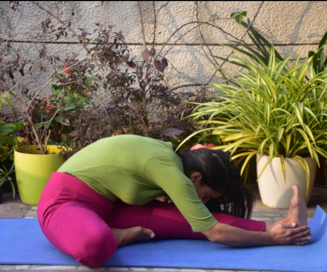 - अब सांस छोड़ते हुए हाथ को नीचे लाना है और सिर को घुटने के जितना पास ले जा सकते हैं ले जाएं।