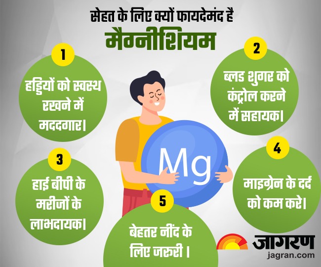 नई दिल्ली, लाइफस्टाइल डेस्क। Health benefits of Magnesium: शरीर को स्वस्थ रखने के लिए कई तरह की विटामिंस और मिनरल्स की जरूरत होती है। आप जो हेल्दी चीजें खाते हैं, उनसे ये पोषक तत्व प्राप्त किए जा सकते हैं। इसलिए हेल्थ एक्सपर्ट भी नियमित रूप से पौष्टिक भोजन करने की सलाह देते हैं, जिससे आप कई तरह की घातक बीमारियों से बच सकते हैं। मैग्नीशियम एक ऐसा ही पोषक तत्व है, जो शरीर को स्वस्थ रखने के लिए बेहद आवश्यक है। शरीर में इसकी कमी से कई बीमारियां पैदा होती हैं। मैग्नीशियम हृदय, ब्लड शुगर समेत कई बीमारियों को कम करने में कारगर है। आइए जानते हैं, यह सेहत के लिए क्यों फायदेमंद है और इसे किन फूड्स के जरिए प्राप्त किया जा सकता है।