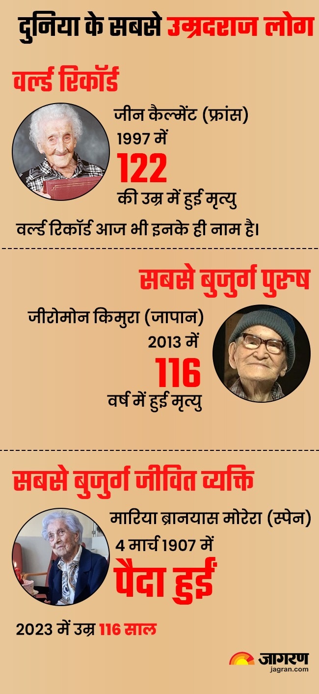 आधिकारिक रिकॉर्ड्स को देखा जाए, तो मानव इतिहास में अभी तक सिर्फ एक शख्स ऐसा हुआ है जो 120 साल की उम्र तक जिया हो। फ्रांस की रहने वाली जीन कैलमेंट ने साल 1997 में आखिरी सांस ली थी, उस वक्त उनकी उम्र 122 साल और 164 दिन थी। वह एकलौती ऐसी हैं जो उम्र के इस पड़ाव तक पहुंची हों। हालांकि, कैलमेंट की लंबी उम्र पर भी कई सवाल उठे और ऐसा कहा गया कि वास्तव में, उनकी बेटी उनके नाम से जी रही थीं।