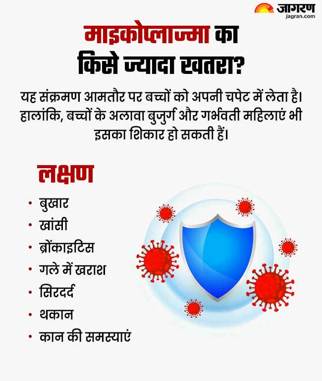 बात करें इसके लक्षणों की, तो माइकोप्लाज्मा संक्रमण के सामान्य लक्षणों में बुखार, खांसी, ब्रोंकाइटिस, गले में खराश, सिरदर्द और थकान आदि शामिल हैं। इसके अलावा निमोनिया भी इसका एक परिणाम है, जिसकी वजह से कई बार गंभीर मामलों में अस्पताल में भर्ती होने की जरूरत भी पड़ सकती है। साथ ही इस संक्रमण की वजह से मध्य कान की समस्याएं (ओटाइटिस मीडिया) भी हो सकती हैं। इसके लक्षण कुछ दिनों से लेकर एक महीने तक रह सकते हैं। यह लक्षण आम तौर पर संक्रमित होने के दो से तीन सप्ताह बाद शुरू होते हैं।
