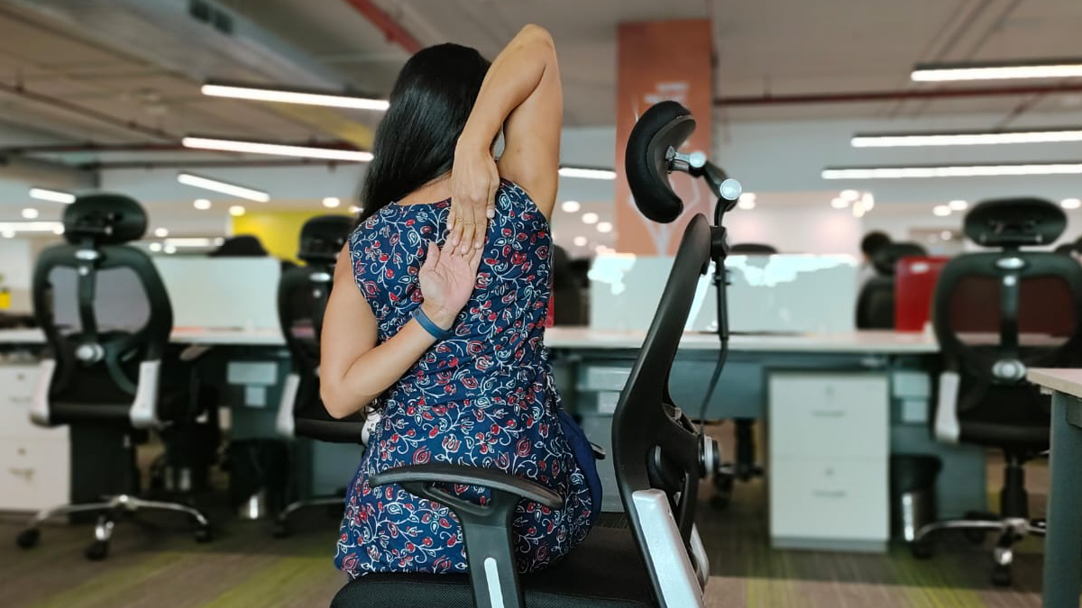 इस आसन को आप आराम से अपनी कुर्सी पर बैठकर भी कर सकते हैं। इसके लिए एक तरफ का हाथ ऊपर उठाएं और पीठ के पीछे की तरफ ले जाएं। अब दूसरा हाथ नीचे की तरफ से पीठ के पीछे की तरफ लेकर जाएं। पीठ के पीछे इन दोनों हाथों को आपस में उंगलियों की मदद से पकड़ने का प्रयास करें। अब इस प्रक्रिया को दूसरी तरफ से भी कर लें।