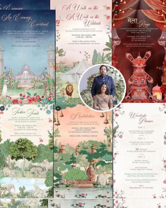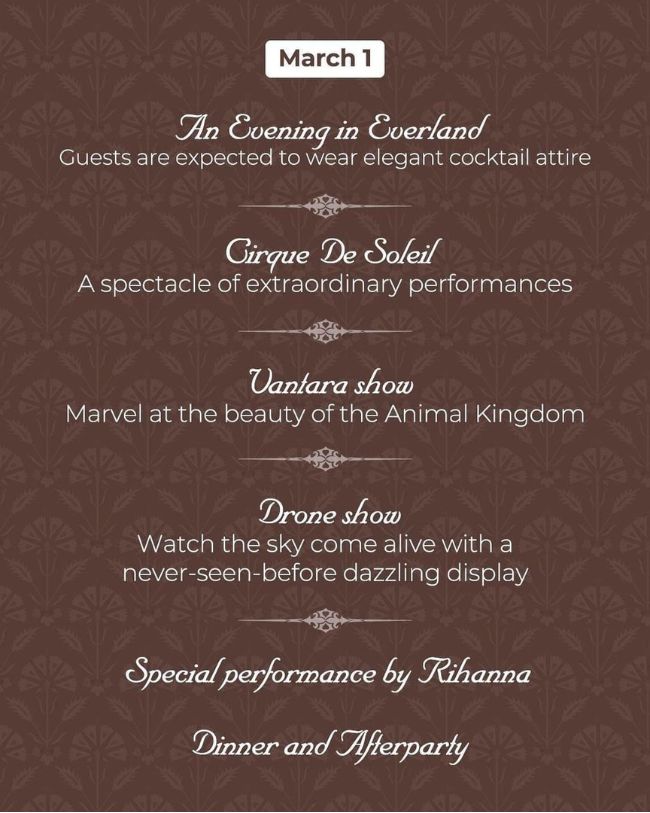 प्री-वेडिंग में तीन दिनों तक अलग-अलग थीम के फंक्शन्स होने वाले हैं, जिसके लिए मेहमानों को अलग-अलग ड्रेस कोड फॉलो करने पड़ेंगे। इस बात को ध्यान रखते हुए मेहमानों को न्योता भेजने के साथ इवेंट गाइड भी भेजा गया था।