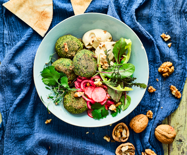 कैलिफोर्निया वॉलनट फलाफल और क्विक पिकल्ड रैडिश बुद्धा बाउल