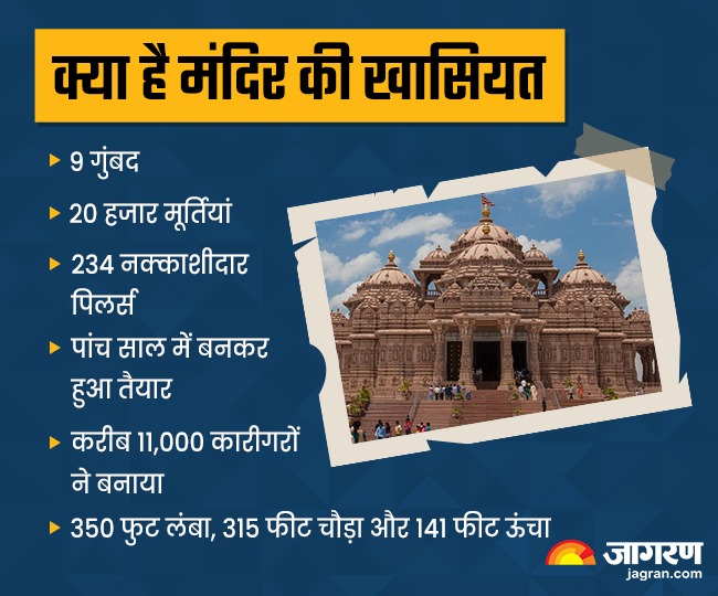 पांच साल में बनकर तैयार हुए इस मंदिर को करीब 11,000 कारीगरों द्वारा बनाया गया है। मंदिर में 234 नक्काशीदार पिलर्स, 9 गुंबद और ऋषियों-मुनियों और देवी-देवताओं की लगभग 20 हजार मूर्तियां हैं। 350 फुट लंबा, 315 फीट चौड़े और 141 फीट ऊंचे इस मंदिर के दर्शन करने हर साल लाखों की संख्या में लोग यहां पहुंचते हैं।