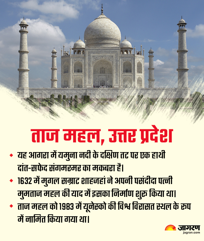 उत्तर प्रदेश के आगरा स्थित ताजमहल को प्यार की निशानी कहा जाता है। सफेद संगमरमर बनी यह इमारत देखने बेहद खूबसूरत है। इस मकबरे को सन 1632 में मुगल सम्राट शाहजहां ने अपनी पत्नी मुमताज के मौत के बाद उनकी याद में बनवाया है। साल 1983 में यूनेस्को ने ताजमहल को विश्व धरोहर स्थलों की सूची में शामिल किया था।