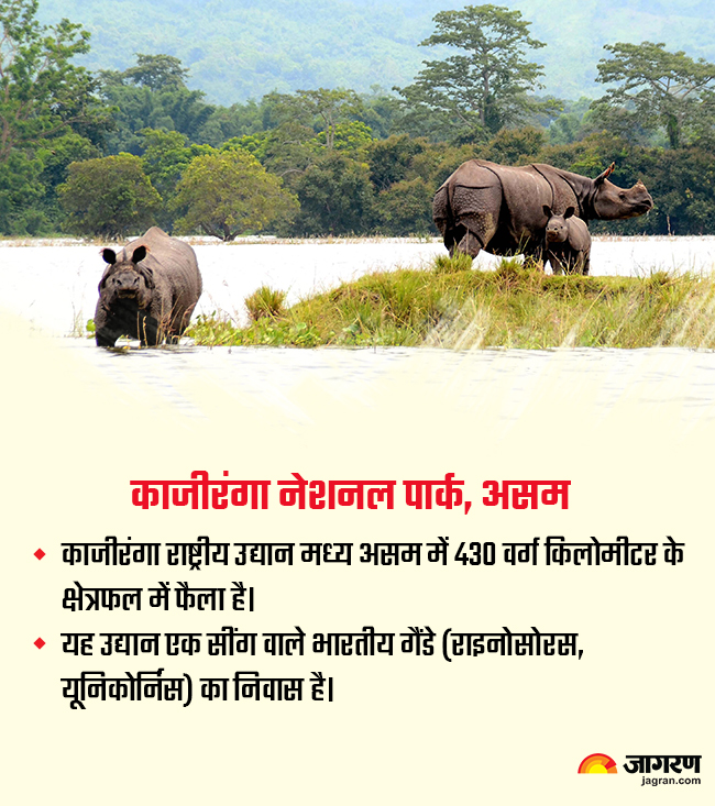 काजीरंगा राष्ट्रीय उद्यान मध्य असम में 430 वर्ग किलोमीटर के क्षेत्रफल में फैला है। यह उद्यान एक सींग वाले भारतीय गैंडे (राइनोसेरोस, यूनीकोर्निस) का निवास है।