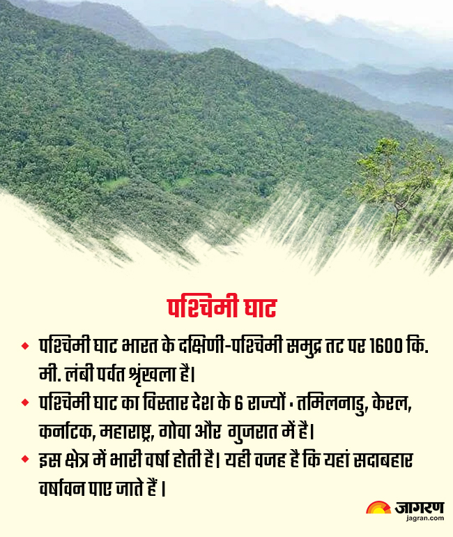 पश्चिमी घाट भारत के दक्षिणी-पश्चिमी समुद्र तट पर 1600 कि.मी. लंबी पर्वत शृंखला है। पश्चिमी घाट का विस्तार देश के 6 राज्यों : तमिल नाडु, केरल, कर्नाटक, महाराष्ट्र, गोवा और गुजरात में है। इस क्षेत्र में भारी वर्षा होती है। यही वजह है कि यहां सदाबहार वर्षावन पाए जाते हैं ।