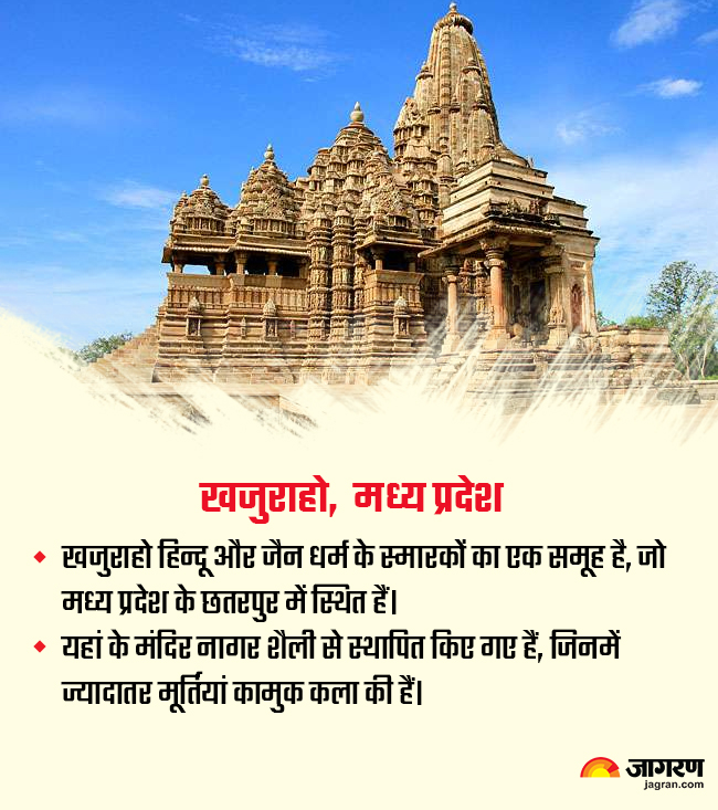 मध्य प्रदेश में मौजूद खजुराहो मंदिर अपनी अनूठी कलाकृतियों के लिए दुनियाभर में काफी प्रसिद्ध है। जैन और हिंदू मंदिरों के संग्रह के साथ ही यहां आपको कामुक मूर्तियां और कलाकृतियां देखने को मिलेंगी। 20 किमी के एरिया में इस मंदिर में कुल 85 मंदिर हैं। इस मंदिर को साल 1986 में विश्व धरोहर की लिस्ट में शामिल किया गया था।