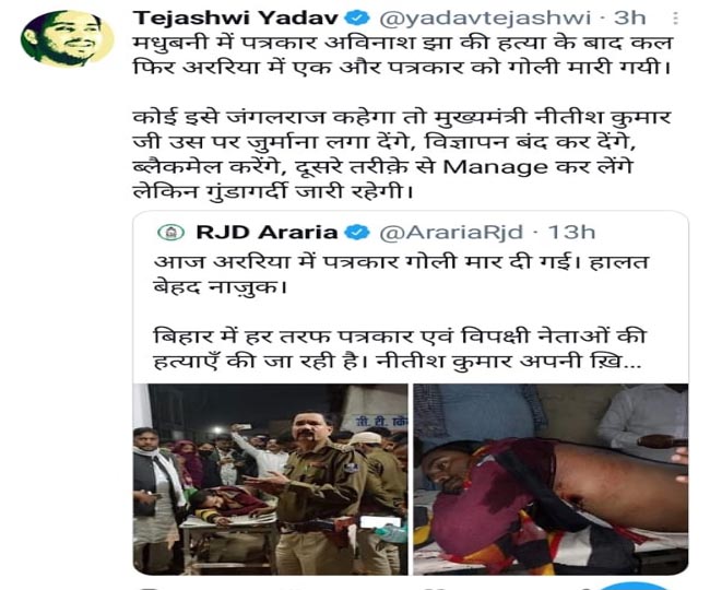 तेजस्वी यादव ने ट्वीट कर लिखा है कि मधुबनी में पत्रकार अविनाश झा की हत्या कर दी गई। अररिया में एक और पत्रकार को गोली मारी गई। कोई इसे जंगलराज कहेगा तो मुख्यमंत्री नीतीश कुमार जी (CM Nitish Kumar) उस पर जुर्माना लगा देंगे। तेजस्वी ने यह भी कहा है कि मुख्यमंत्री विज्ञापन बंद कर देंगे। ब्लैकमेल करेंगे। दूसरे तरीके से मैनेज कर लेंगे लेकिन गुंडागर्दी जारी रहेगी। आरजेडी अररिया की ओर से ट्वीट कर कहा गया कि बिहार में हर तरफ पत्रकार एवं विपक्षी नेताओं की हत्या की जा रही है। नीतीश कुमार अपने खिलाफ उठ रही आवाज को दबा रहे हैं। जिले में अपनी पसंद की बहाली कर केस को भी दबवा रहे हैं। यह तानाशाही ज्यादा दिन नहीं चलने वाली। तेजस्वी यादव ने इसी ट्वीट को रीट्वीट किया है।