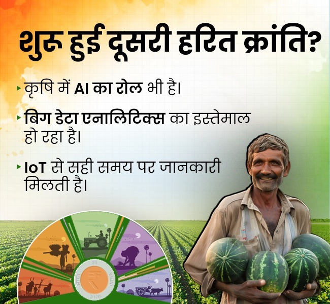 1960 के दशक वाली हरित क्रांति का अधिक जोर उन्नत बीजों और उर्वरकों पर था। लेकिन, अब कृषि में आर्टिफिशियल इंटेलिजेंस (AI) का भी रोल है। कृषि क्षेत्र की चुनौतियों को सुलझाने के लिए एआई के साथ बिग डेटा एनालिटिक्स जैसी अत्याधुनिक तकनीक का भी इस्तेमाल हो रहा है। इसके सकारात्मक नतीजे भी दिख रहे हैं।
