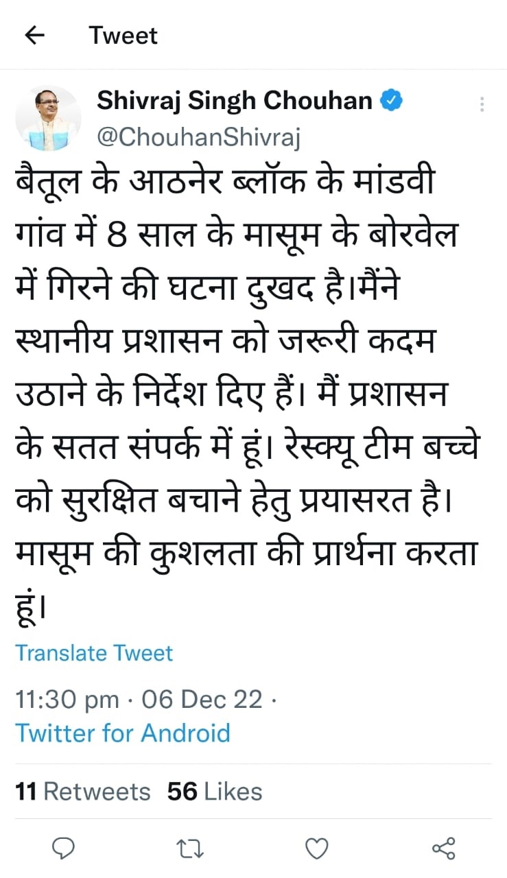 मुख्यमंत्री शिवराज सिंह चौहान ने इस मामले पर संज्ञान लेते हुए ट्वीट किया है। शिवराज ने ट्वीट करते हुए कहा, 'बैतूल के आठनेर ब्लॉक के मांडवी गांव में 8 साल के मासूम के बोरवेल में गिरने की घटना दुखद है।मैंने स्थानीय प्रशासन को जरूरी कदम उठाने के निर्देश दिए हैं। मैं प्रशासन के सतत संपर्क में हूं। रेस्क्यू टीम बच्चे को सुरक्षित बचाने हेतु प्रयासरत है। मासूम की कुशलता की प्रार्थना करता हूं।'