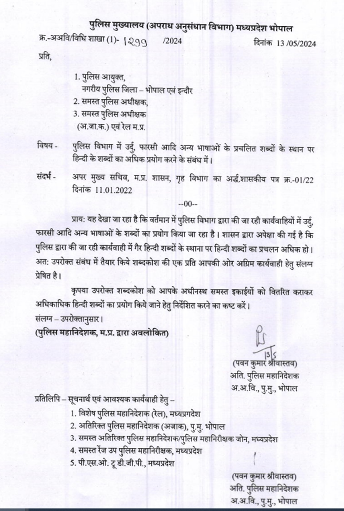 अतिरिक्त पुलिस महानिदेशक पवन श्रीवास्तव ने प्रदेश की सभी जिला पुलिस इकाइयों को स्मरण पत्र भेजकर समस्त कार्यवाही में उर्दू-फारसी के शब्दों के स्थान पर हिंदी शब्दों के अधिक से अधिक उपयोग की अपेक्षा की है। उन्होंने लिखा है कि हिंदी के उपयुक्त शब्द उपलब्ध होने के बाद भी उर्दू-फारसी के शब्दों का उपयोग अधिक हो रहा है जिसे कम करने के आदेश दिए गए हैं।