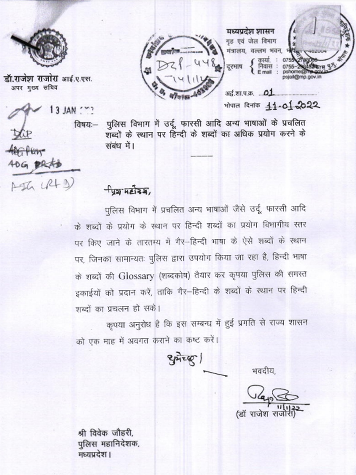 उन्होंने लिखा है कि हिंदी के उपयुक्त शब्द उपलब्ध होने के बाद भी उर्दू-फारसी के शब्दों का उपयोग अधिक हो रहा है, जबकि शासन द्वारा दो साल पहले ही अपेक्षा की गई थी कि हिंदी शब्दों का प्रयोग अधिक हो। उल्लेखनीय है कि पुलिस ने कार्यवाही में उपयोग होने वाले उर्दू, फारसी के 69 शब्दों की जगह सरल हिंदी के शब्द सुझाए थे।