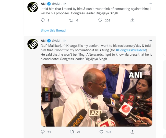 जानकारी हो कि मध्य प्रदेश के पूर्व मुख्यमंत्री और कांग्रेस के नेता दिग्विजय सिंह ने कहा कि मल्लिकार्जुन खड़गे कांग्रेस के वरिष्ठ नेता है और मैं उनका काफी आदर भी करता हूं इसलिए मैंने तय किया है कि मैं उनका (नामांकन भरने में) समर्थन करुंगा।