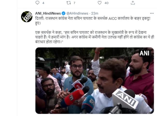 वहीं दूसरी और राजस्थान कांग्रेस नेता सचिन पायलट के समर्थक AICC कार्यालय के बाहर इकट्ठा हुए हैं। एक समर्थक ने कहा की हम सचिन पायलट को राजस्थान के मुख्यमंत्री के रूप में देखना चाहते हैं। ये हमारी मांग है। अगर कांग्रेस में जमीनी नेता उत्पन्न नहीं होंगे तो कांग्रेस का ये ही बंटाधार होता रहेगा।
