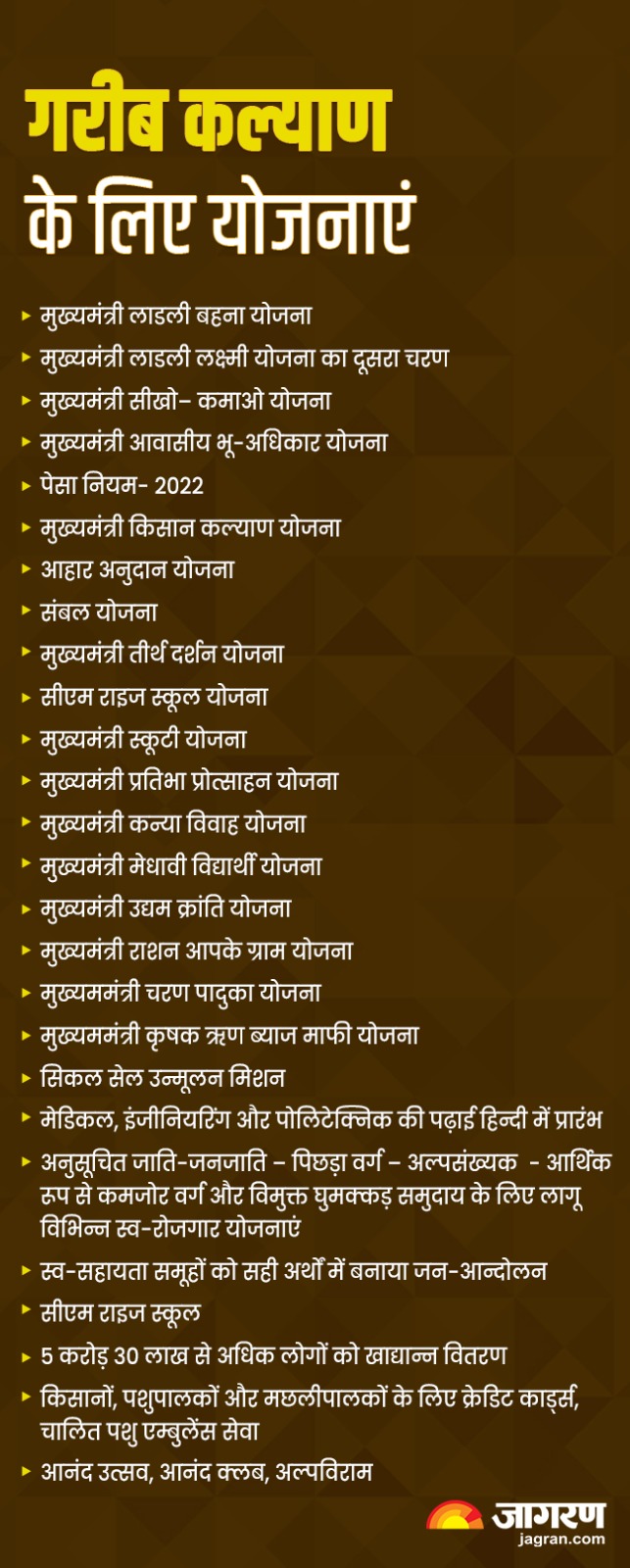इसके साथ ही सीएम ने कहा कि मुख्यमंत्री प्रतिभा प्रोत्साहन योजना, मुख्यमंत्री कन्या विवाह योजना, मुख्यमंत्री मेधावी विद्यार्थी योजना, मुख्यमंत्री उद्यम क्रांति योजना, मुख्यमंत्री राशन आपके ग्राम योजना, मुख्यमंत्री जल पात्रता योजना, जिसका क्रियान्वयन अभी तक चल रहा है।