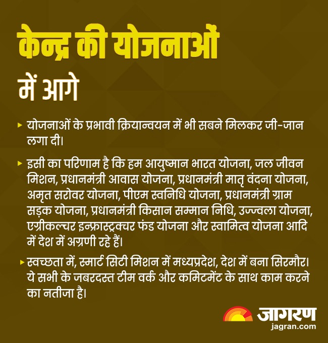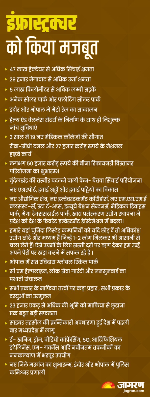 सीएम शिवराज ने कहा कि हमने 2030 में जिस मध्य प्रदेश की तकदीर और तस्वीर बदलने का जो सपना देखा है, वो आपके साथ और आपके समर्पण के बिना पूरा नहीं हो सकता है। उन्होंने कहा कि चाहे अर्थव्यवस्था को 45 लाख करोड़ तक पहुंचाने का लक्ष्य हो या फिर 1 करोड़ से अधिक लोगों को गरीबी रेखा से बाहर निकालने का, चाहे कृषि उत्पादन बढ़ाकर 10 करोड़ मीट्रिक टन के स्तर तक ले जाना हो या फिर सिंचाई क्षमता 65 लाख लाख हेक्टेयर तक पहुंचाना हो, चाहे मध्यप्रदेश की ऊर्जा क्षमता 38 हजार मेगावाट से भी अधिक करना हो या फिर बहनों की आमदनी को 10 हजार रुपये महीना तक पहुंचाने की बात - मुझे पूरा विश्वास है कि आगे भी टीम मध्यप्रदेश मिलकर इन लक्ष्यों की पूर्ति के लिए इसी तरह दिन-रात काम करेगी।