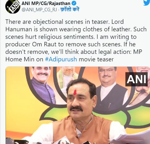 जबकि उनके लिए कहा जाता है कि कानन कुंडल कुंचित केसा, हाथ बज्र औ ध्वजा बिराजै, कांधे मूंज जनेऊ साजै। इसके बाद भी जिस तरह से उन्हें फिल्म में दिखाया गया है, वह आस्था के साथ विश्वासघात है। गृह मंत्री नरोत्तम मिश्रा ने कहा कि इस संबंध में मैं इस फिल्म के निर्माता ओम राउत को पत्र लिख रहा हूं।