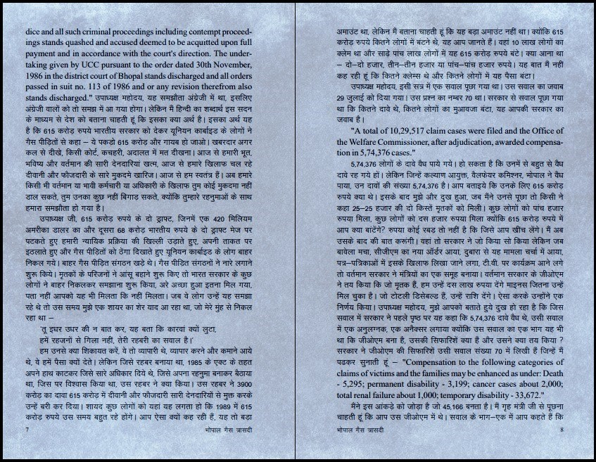 615 करोड़ रुपये भारतीय सरकार को देकर यूनियन कार्बाइड के लोगों ने गैस पीड़ितों से कहा - ये पकड़ो 615 करोड़ और गायब हो जाओ। खबरदार अगर कल से दीखे, किसी कोर्ट, कचहरी, अदालत में मत दीखना। आज से हमारी भूत, भविष्य और वर्तमान की सारी देनदारियां खत्म, आज से हमारे खिलाफ चल रहे दीवानी और फौजदारी के सारे मुकदमे खारिज।