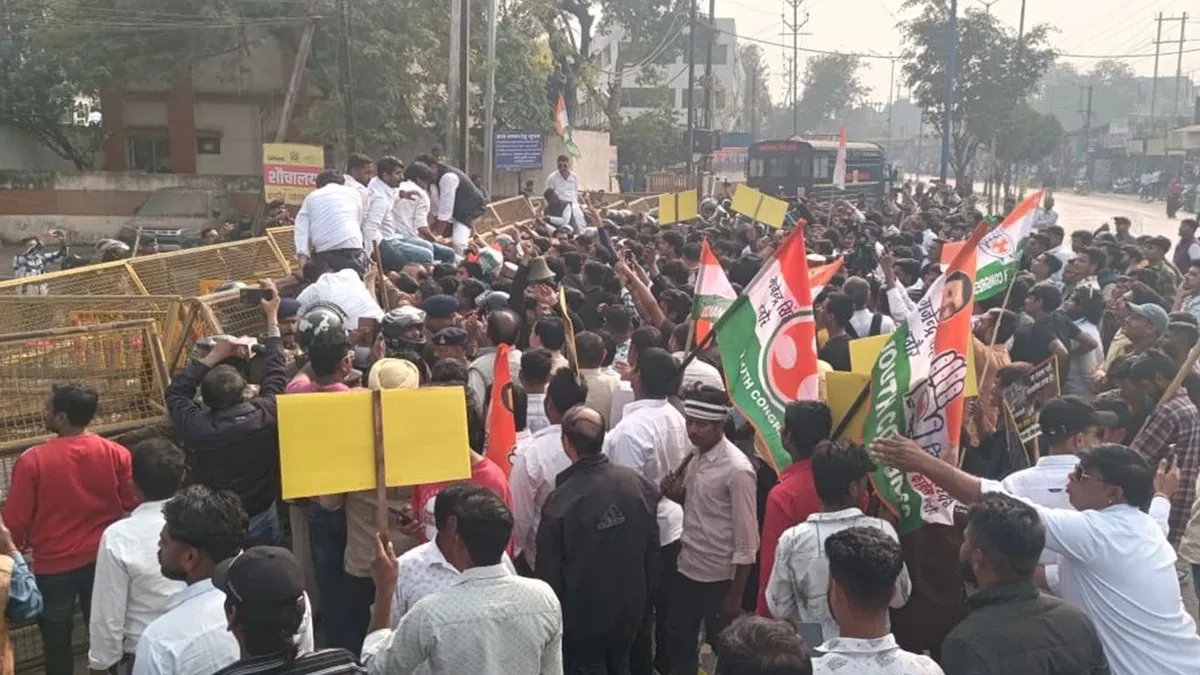 इंदौर में प्रदर्शन करते युवा कांग्रेस कार्यकर्ता।