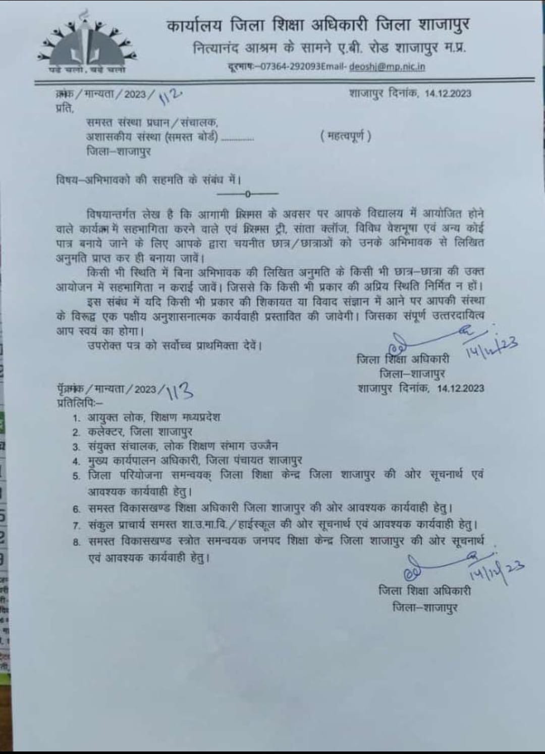 MP News एमपी के शाजापुर में जिला शिक्षा अधिकारी ने क्रिसमस को लेकर एक आदेश जारी किया है। जिला शिक्षा अधिकारी ने निर्देश दिया है कि प्राइवेट और सरकारी स्कूलों में बच्चों को जबरन सेंटा क्लॉज नहीं बनाया जा सकता है। इस आदेश में कहा गया है कि छात्रों को सेंटा क्लॉज बनाने से पहले परिजनों की अनिमति ली जाए।
