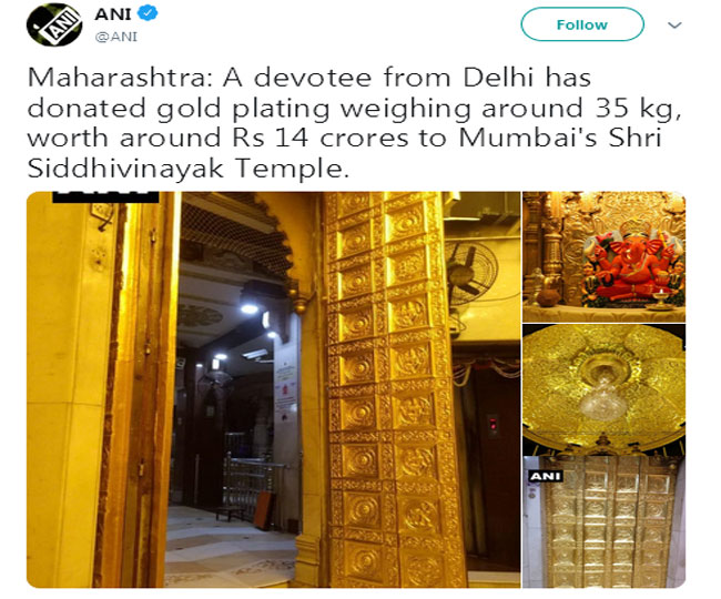 Siddhivinayak Temple मुंबई के सिद्धि विनायक मंदिर में दिल्ली के एक भक्त ने 14 करोड़ मूल्य का 35 किलो सोना दान में दिया है।