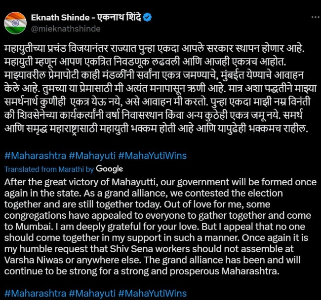 शिंदे ने सोशल मीडिया मंच ‘एक्स’ पर कहा, महायुति गठबंधन की बड़ी जीत के बाद राज्य में एक बार फिर हमारी सरकार बनेगी। हमने एक महागठबंधन के रूप में मिलकर चुनाव लड़ा और हम आज भी साथ हैं। उन्होंने अपने समर्थकों से ‘वर्षा निवास’ के बाहर या उनके समर्थन में किसी अन्य स्थान पर इकट्ठा नहीं होने की अपील की।