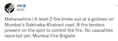 मुंबई, एजेंसी। Mumbai Fire: मुंबई के साकीनाका-खैरानी रोड ( Sakinaka-Khairani road) पर एक गोदाम में मंगलवार सुबह लेवल-2 में आग लग गई। आग की सूचना मिलते ही दमकल विभाग को सूचित कर दिया गया था। समाचार एजेंसी एएनआइ के मुताबिक दमकल के आठ वाहन मौके पर मौजूद हैं और आग पर काबू पाने में लगे हुए हैं।