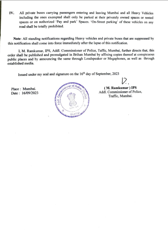 मुंबई पुलिस द्वारा जारी नोटिस में उत्सव के दौरान यातायात को चालू रखने के लिए डायवर्जन, नो-एंट्री पॉइंट और वैकल्पिक मार्गों सहित विस्तृत व्यवस्था का विवरण साझा किया गया है। पुलिस ने बताया कि गणेश उत्सव के दौरान पूरे मुंबई में कुल 13,726 पुलिसकर्मी तैनात किए गए हैं। पुलिस के अनुसार, दक्षिण मुंबई में सभी प्रकार के भारी वाणिज्यिक वाहनों और निजी बसों की आवाजाही पर पूर्ण प्रतिबंध लागू रहेगा।