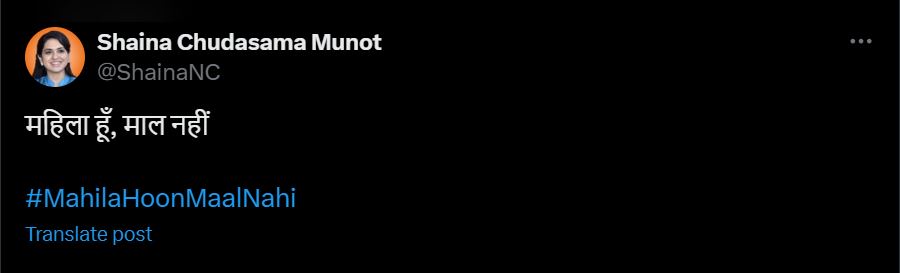 शाइना ने दक्षिणी मुंबई के सांसद और शिव सेना (उद्धव गुट) के नेता अरविंद सावंत पर पलटवार करते हुए एक ‘एक्स’ पोस्ट में लिखा, “महिला हूँ, माल नहीं।’’ इसके साथ ही शाइना NC ने अरविंद सावंत के खिलाफ FIR दर्ज करा दी है।