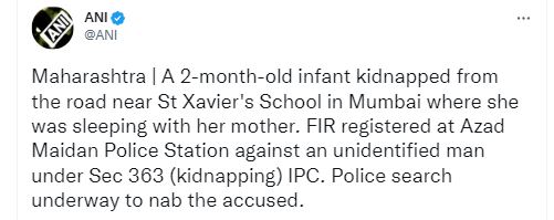 मुंबई, एजेंसी। मुंबई में सेंट जेवियर्स स्कूल के पास सड़क पर मां के साथ सो रही दो माह की बच्ची का अपहरण के मामले में आजाद मैदान पुलिस ने बच्ची को बरामद कर उसके परिवार को सौंप दिया है और आरोपित मोहम्मद हनीफ शेख को गिरफ्तार कर लिया है। बता दें कि आरोपित को पकड़ने के लिए पुलिस ने आठ टीमों का गठन किया था।