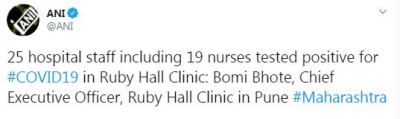 पुणे के रुबी हॉल क्लिनिक के मुख्य कार्यकारी अधिकारी बोमी भोटे ने जानकारी दी है कि इस क्लिनिक 19 नर्स समेत अस्पताल के 25 कर्मचारी कोरोना पॉजिटिव पाये गये हैं। गौरतलब है कि महाराष्ट्र में कोरोना संक्रमित रोगियों की संख्या बढ़ती ही जा रही है सोमवार को राज्य में 466 नये मामले सामने आये और नौ लोगों की मौत हुई और 65 रोग स्वस्थ होकर घर चले गये। महाराष्ट्र स्वास्थ्य विभाग के अनुसार अब तक राज्य में कुल संक्रमितों की संख्या 4666 तक पहुंच चुकी है और 232 कोरोना पॉजिटिव मरीजों की मौत हो चुकी है, कुल 572 रोगी ठीक हो चुके हैं।