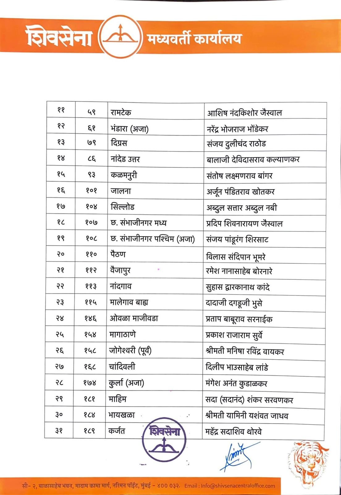 मंगलवार को शिवसेना ने अपने 45 प्रत्याशियों की सूची जारी की है। मुख्यमंत्री एकनाथ शिंदे कोपरी-पचपाखाड़ी विधानसभा क्षेत्र से चुनाव लड़ेंगे। सदा सर्वंकर राज ठाकरे के बेटे अमित ठाकरे के खिलाफ माहिम से चुनाव मैदान में होंगे। जालना से अर्जुन पंडितराव खोतकर को प्रत्याशी बनाया गया है। प्रकाश राजाराम सुर्वे मागाठाणे विधानसभा सीट पर अपनी किस्मत आजमाएंगे। अब्दुल सत्तार अब्दुल नबी को सिल्लोड सीट से उतारा गया है।