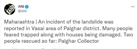 मुंबई, एजेंसी। Maharashtra Landslide: महाराष्ट्र में मानसूनी बारिश (Monsoon Rain) का दौर जारी है, इसी बीच राज्य के पालघर (Palghjar) जिले के वसई इलाके (Vasai area ) में भूस्खलन (Landslide) की घटना सामने आयी है। पालघर कलेक्टर (Palghar Collector) के अनुसार घरों के क्षतिग्रस्त होने के कारण कई लोगों को यहां फंसे होने की भी आशंका जतायी जा रही है। समाचार एजेंसी एएनआइ के अनुसार अब तक दो लोगों को बचाया जा चुका है।